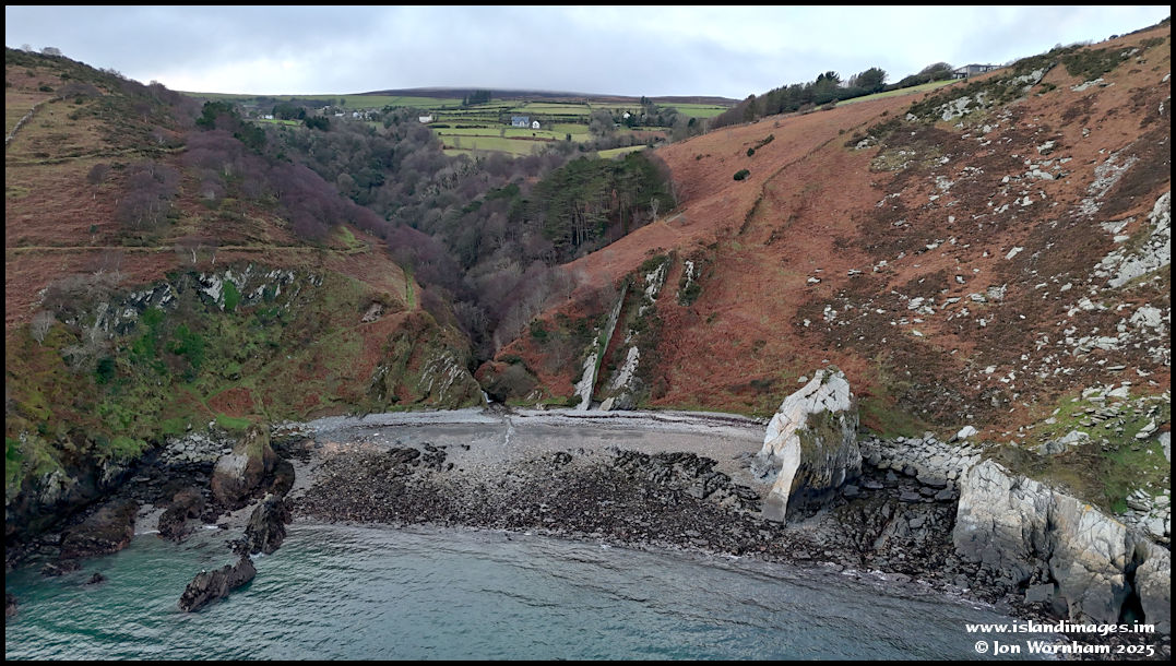 Down at the beach and taking the drone back up for some shots before heading back up the outside path. This is a general view of the beach looking into the glen. The outside path can be seen zig-zagging up on the left.