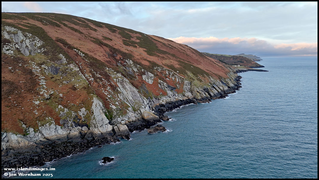 Turning the camera to look northwards along the coast, towards Port Cornaa with Maughold Head in the distance.