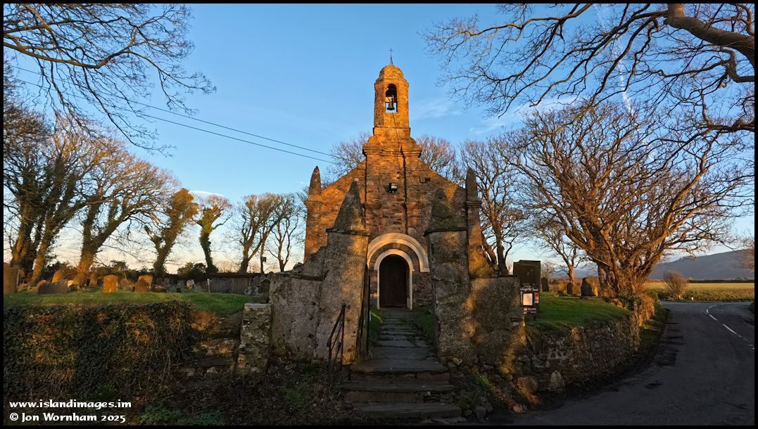 An end on view of the church through the leaning gateposts. Although it was replaced by the new church in 1832 and fell into decay, it was re-roofed in 1849 with further restorations in 1877 & 1955. It is still used for occasional services.