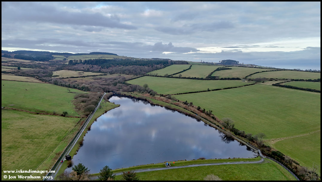 Turning the camera around to look upstream across The Clypse Reservoir dam.