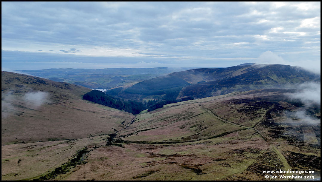 The cloud has temporarily cleared enough for this view down to Injebreck, across the source of the River Glass. The one time coach road up from the Injebreck Pleasure Grounds can be seen running across the slopes of Injebreck Hill.