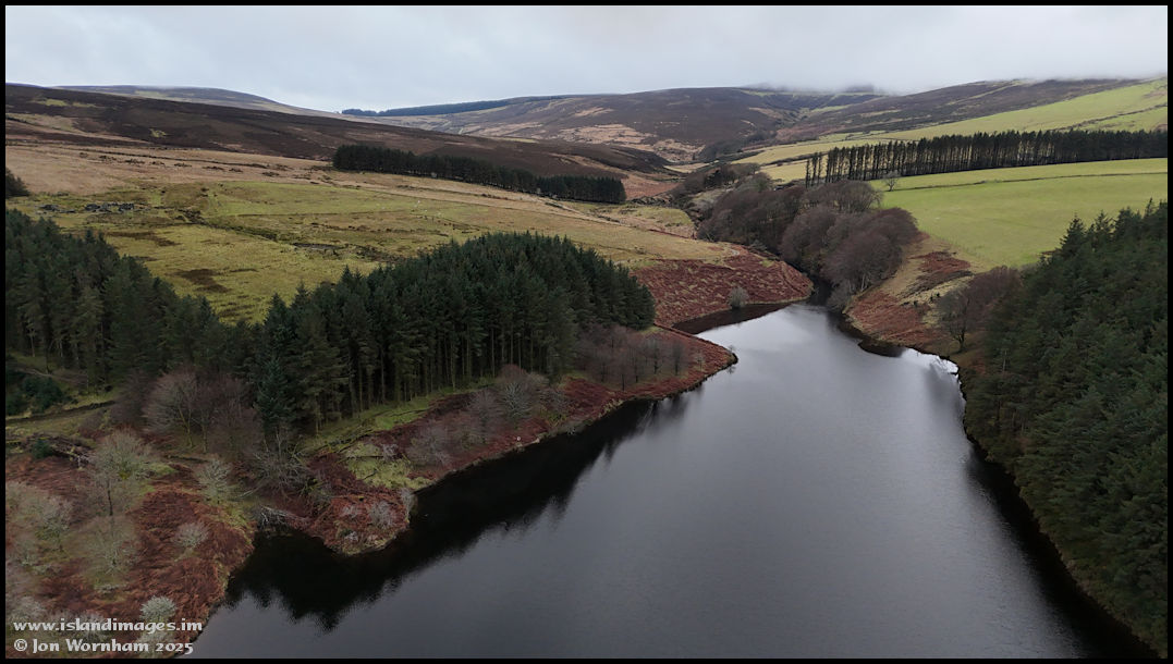 The reservoir has four legs to it, following the valleys of rivers that used to merge into the Sulby River in this area. This is looking along the Druidale leg, Slieau Freoaghane in the clouds beyond.