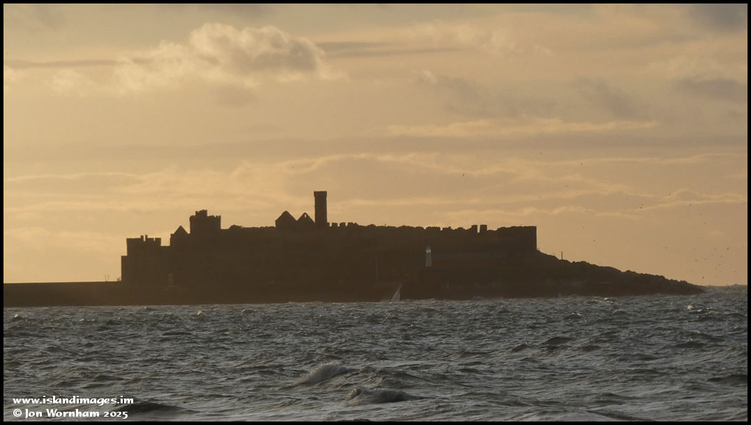Zooming across the sea to where Peel Castle is silhouetted against an orange sunset sky.