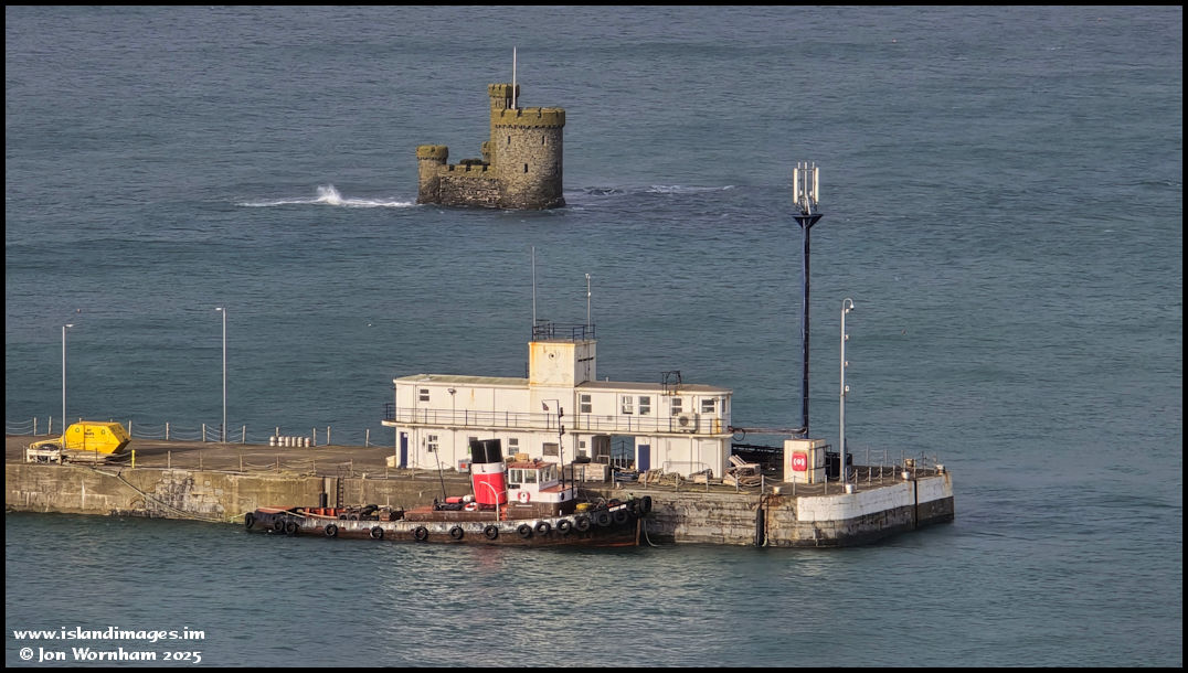 The end of the Victoria Pier with the Tower of Refuge behind. Laxey Towing Company's tug 'Wendy Ann' moored at the pier. (115mm 10x zoom)