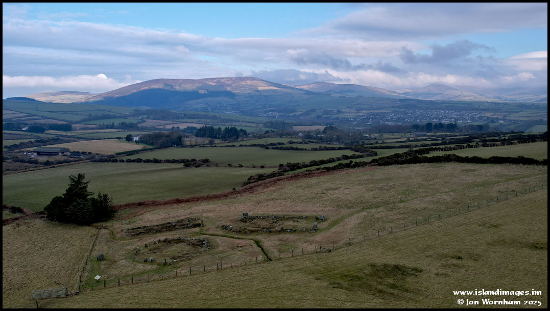 A general view across The Braaid, with the round and long houses in the foreground, then looking across the central valley to where the hazy hills beyond are bathed in sunlight.