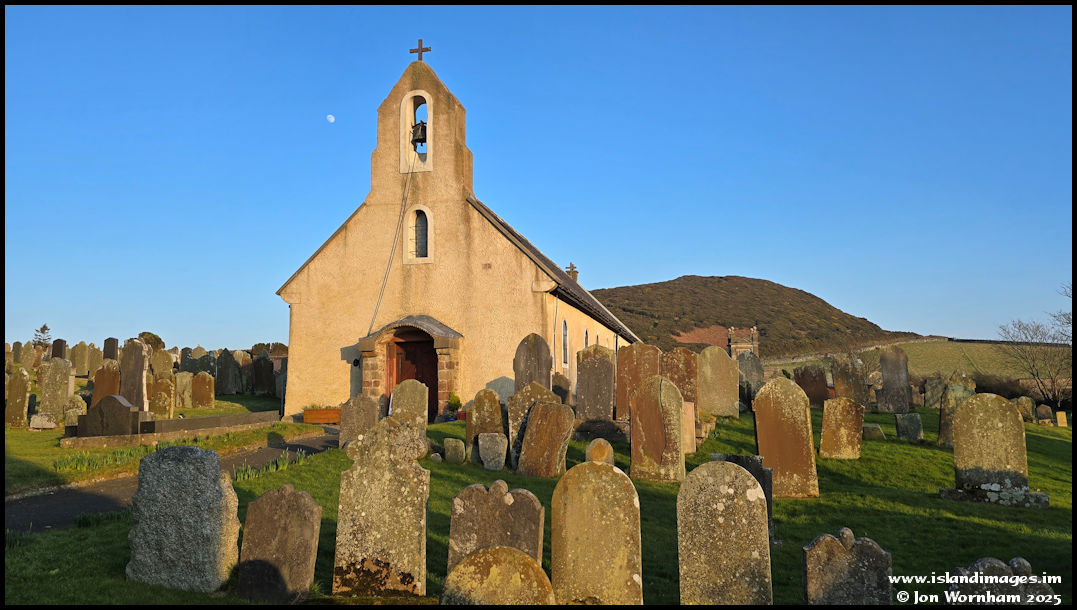 Maughold Church with a rising half moon behind.  The church can look rather drab in some lighting but today a low hazy sun is illuminating it well.  I wonder what it would look like without the rendering covering the stones?