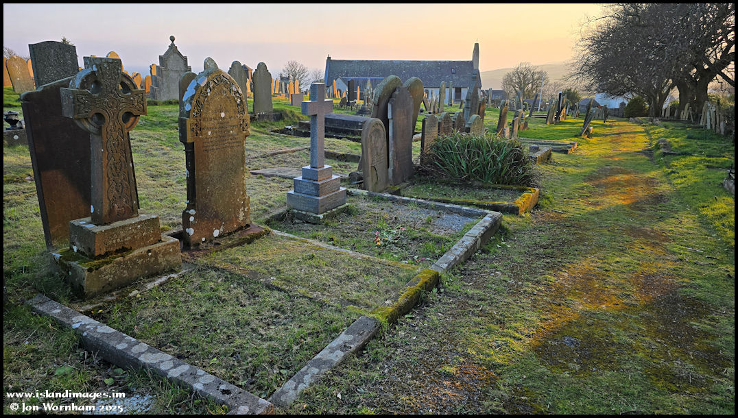A low sun angle highlighting these gravestones, the nearest one styled after the ancient Celtic crosses.