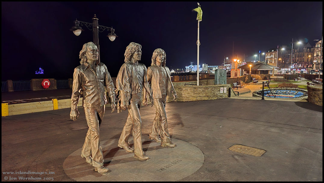Born in Douglas, the Bee Gees stride out on the promenade, with rather eerie looking Tower of Refuge floating in the blackness beyond.