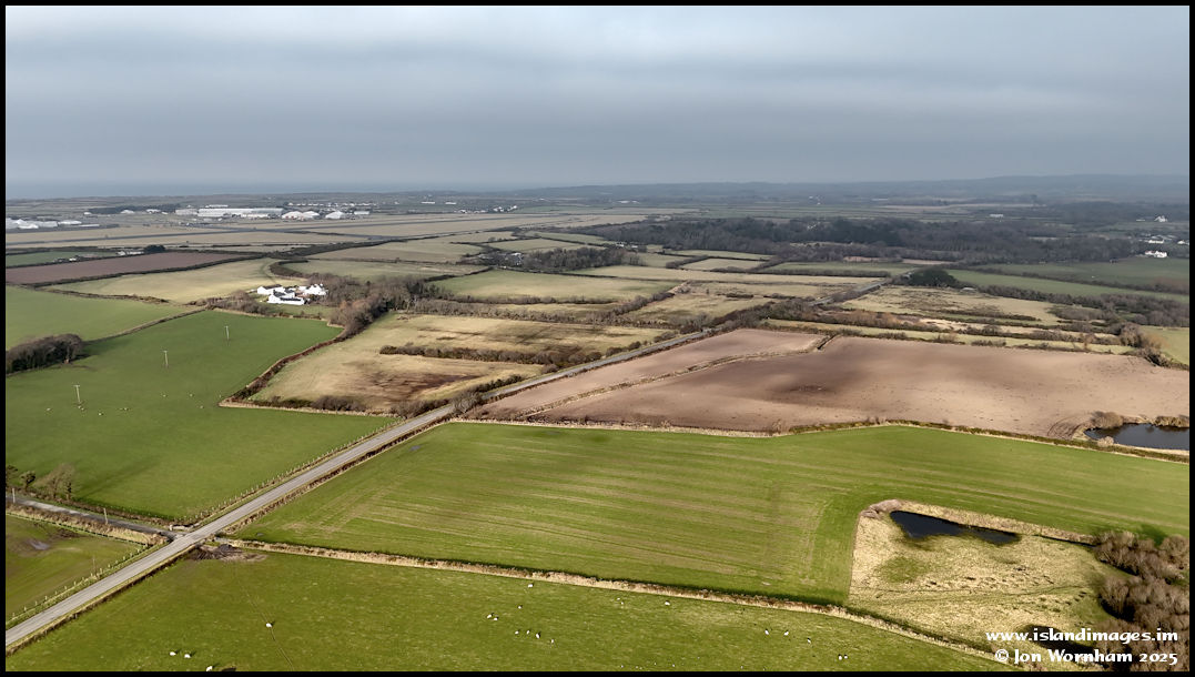 Flat agricultural land to the north of the Killane River, with Jurby Airfield visible at the top left.