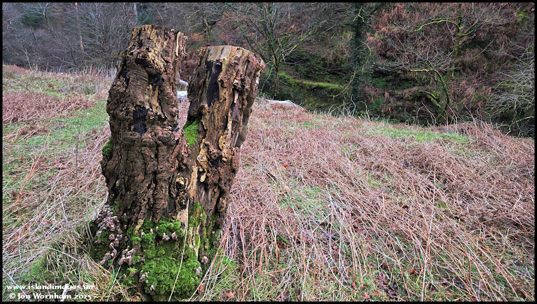 A gnarly old tree stump in the area between the road and river. It would be a lovely area for picnics in the summer, but isn't maintained as such and gets overgrown by bracken and brambles.