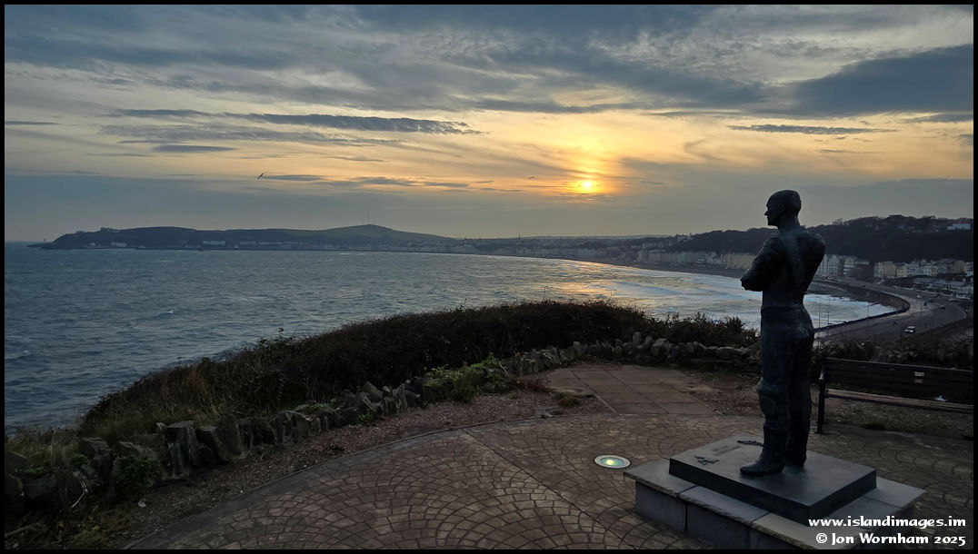 This is looking past the statue to motorcycle racer Steve Hislop (1962 - 2003) and over Douglas Bay.