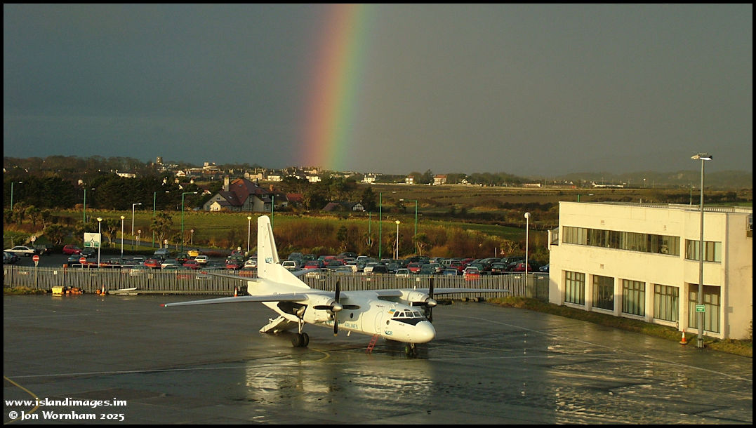 I was evidently at work on the 7th March 2005 to take this picture of an Antonov An12 parked on the west apron at Ronaldsway with a lovely rainbow behind.