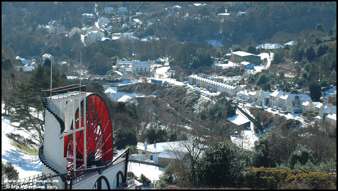 Another snowy day on the 4th March 2006 and I went up the Angeash road to get this shot of the Laxey Wheel with the village behind.