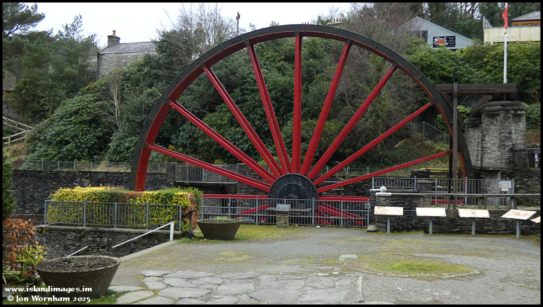 The Snaefell Wheel. Originally installed much further up the valley in 1885, then sold to Cornwall when the Snafell Mine closed in 1910. Returned to the island and restored in the early 2000s.