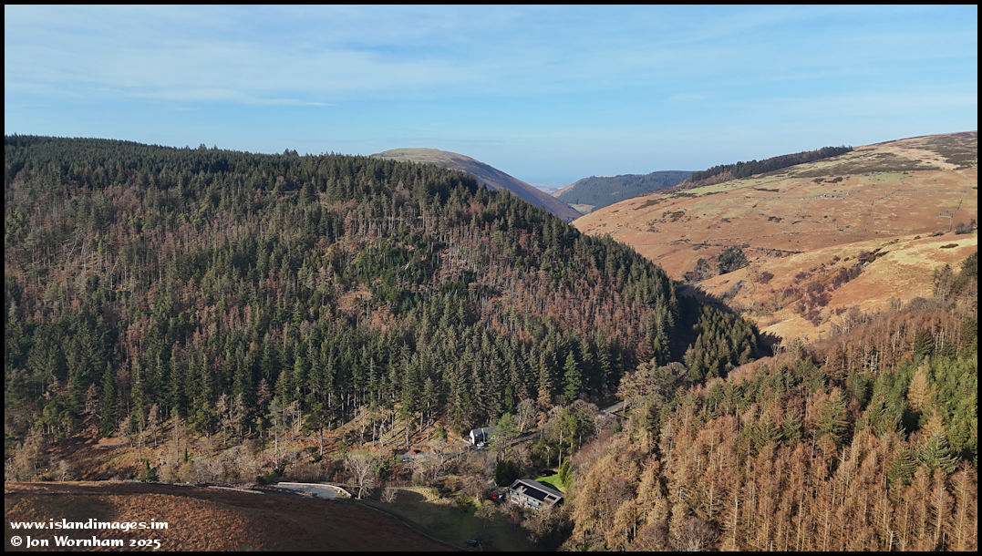 I had inteneded to shoot a panorama from the previous location, but after three attemps where the 'Fly' app failed to capture the required shots I reduced altitude and moved the location a bit, this is looking north along Sulby Glen.