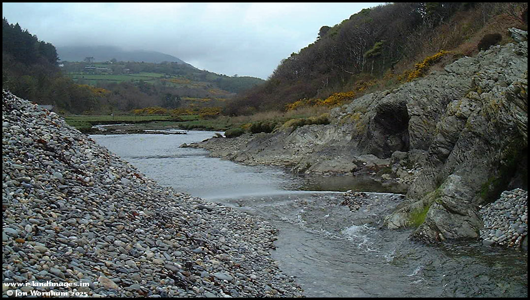 A rather dull 27th April 2000 at Port Cornaa, where the river has cut a deep channel through the shingle beach that retains the lagoon. North Barrule is cloud capped in the distance.