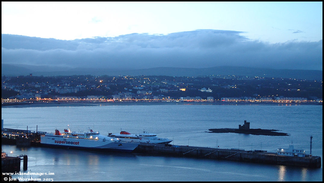 An evening view across Douglas Harbour on the 30th April 2003, with no less than two Isle of Man Steam Packet fastcraft berthed on the Victoria Pier.
