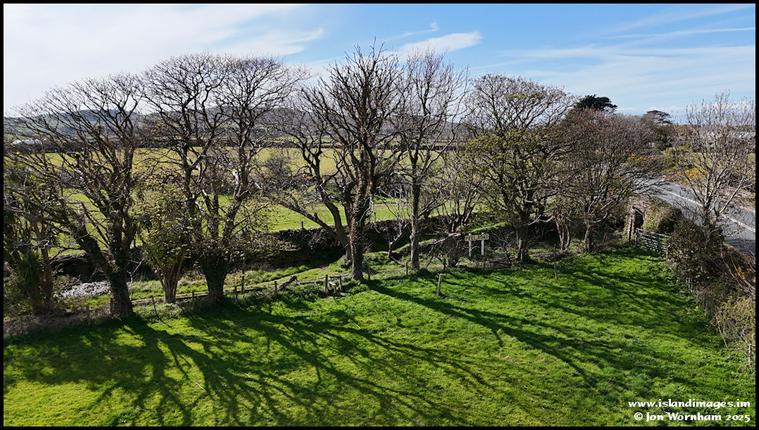 Moving the angle round and dropping down lower to show the restored station nameboard and the stone road overbridge. A path leads down from the road to the former trackbed.
