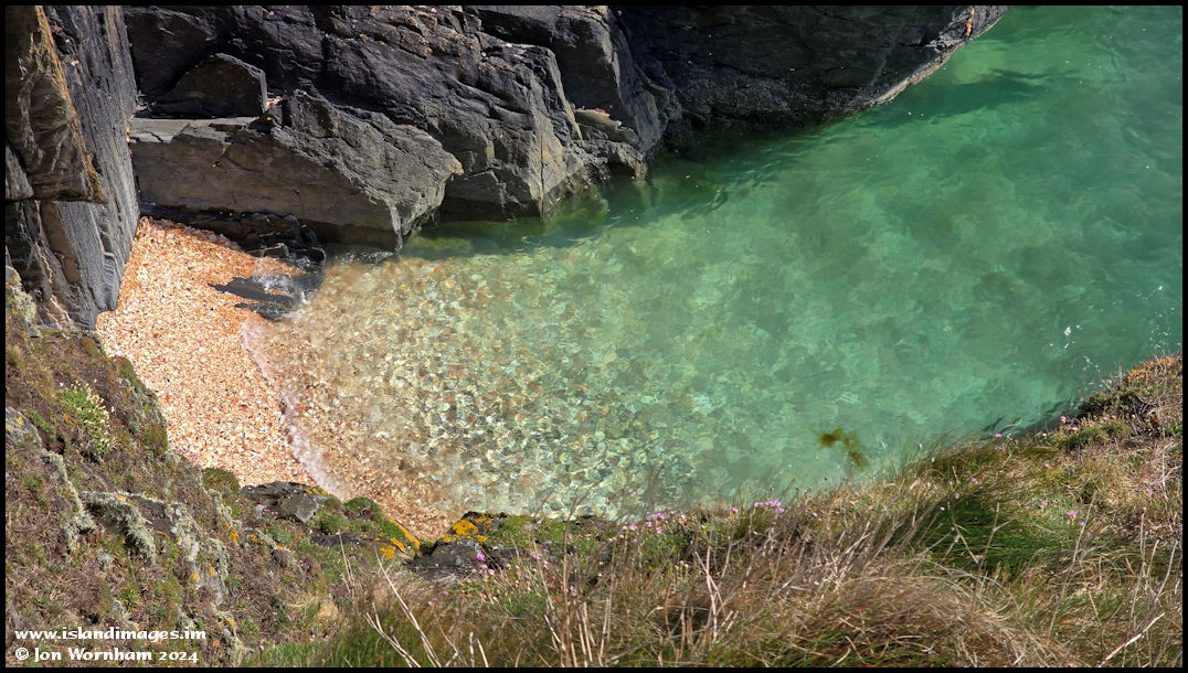 Looking down from the footpath to some lovely colours by a little beach, which is entirely made up of scallop shells.