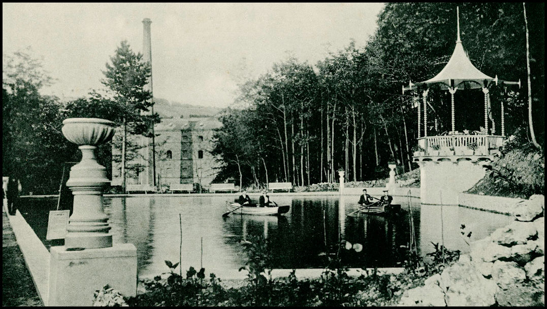 The Boating Lake and bandstand in around 1910, with the flour mill behind.