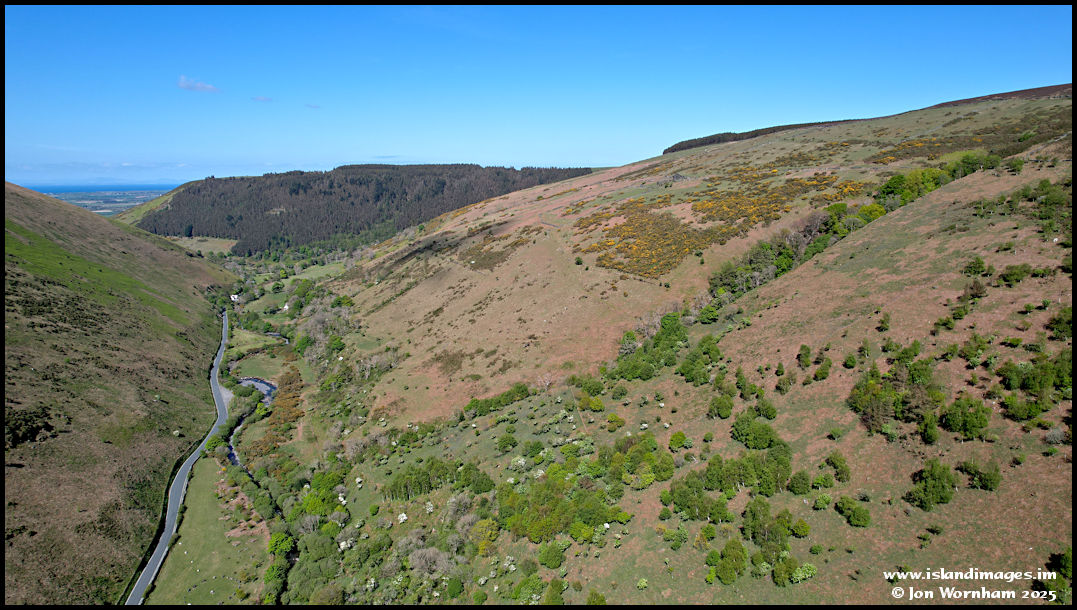 Turning the camera around to look north and climbing a bit higher for this shot, with the flatter lands in the north of the island coming into view. Ballamish tholtan can just be seen on the hillside.