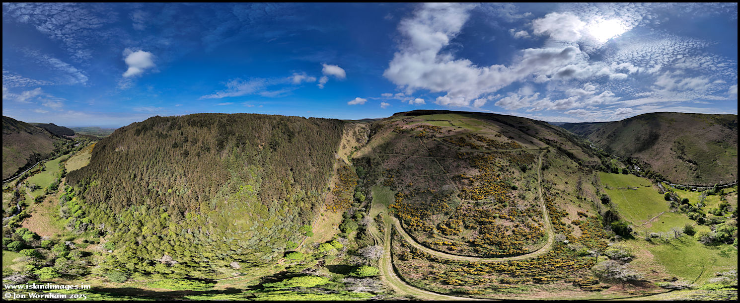 360 degree panorama over the 'unnamed valley' off Sulby Glen, possibly Glen Mooar. Lots of old field patterns and green lanes on the hillside.