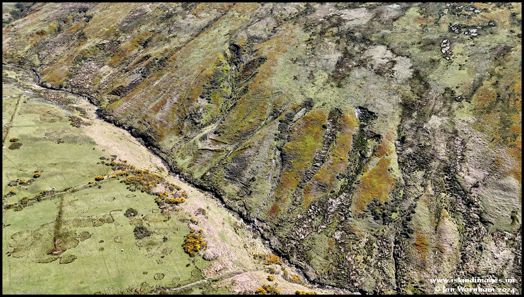 The Block Eary valley lies below the nothern slopes of Snaefell and these channels are formed by water draining off the mountain. Some interesting circular shapes in the grass on the lower left.