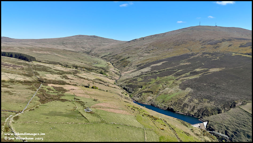 Turning the camara around to look back up the valley, with the reservoir and unknown tholtan in the foreground and Block Eary tholtan just visible around the centre of the picture.