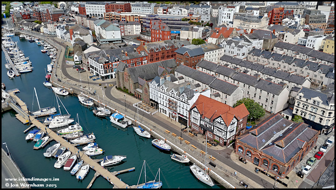 Looking down on the marina and North Quay area, where a nice, mainly pedestrian area has been created. Market Hall (no longer a market!) and 'The British' bottom right.