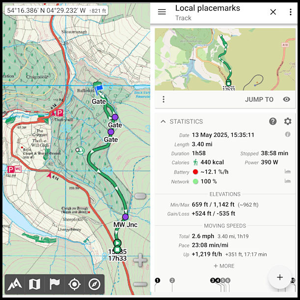 GPS track of my walk to Ballaskella. As you can see from the map it's a much shorter distance to climb up the zig-zag path from Sulby Glen, but then again much steeper!