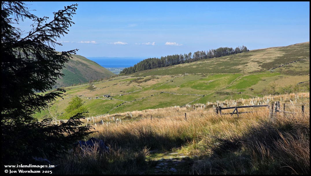 After twisting around through the plantation, the track brings you to this gate with a lovely view across the Block Eary valley to Slieaumanagh tholtan and then out through the end of Sulby Glen.