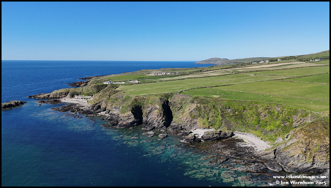 Pulling back for the wider picture again and looking along the coastline to the cottages at Niarbyl, with Peel Hill in the distance.
