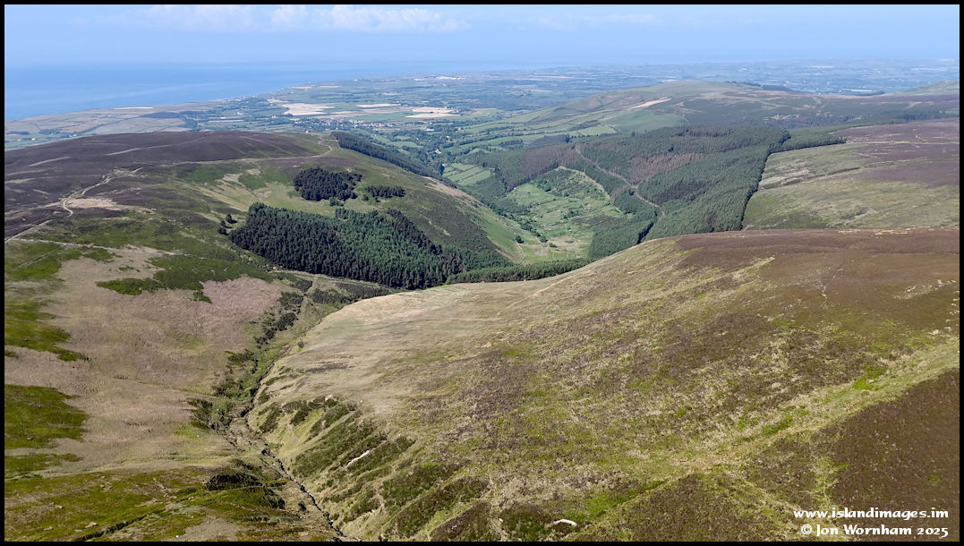 Looking down to the top end of the 'hidden valley' of Glen Dhoo. A bit hazy but Ballaugh and the flatter lands of the north of the island in the distance.