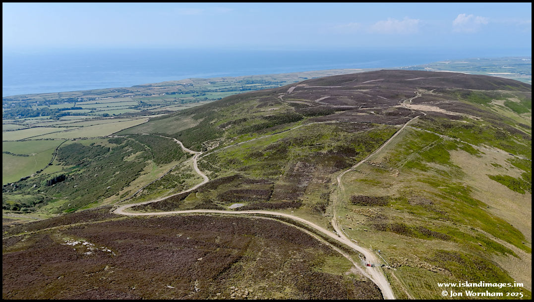 Climbing higher to show the Baltic Road snaking down into the valley, with the other track continuing along before starting the drop down to Ballacob after passing the rounded hilltop of Slieau Curn.