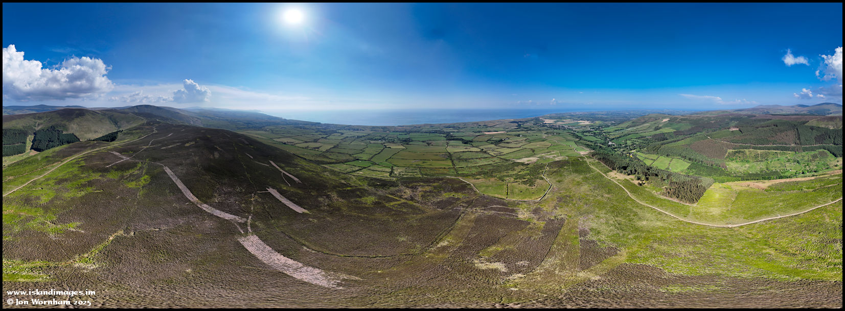 The final 360 degree panorama in this sequence starts by looking down the steep drop on the track to Ballacob, before rotating over Glen Dhoo and looking back along the track to Slieau Freoaghane and Sartfell.