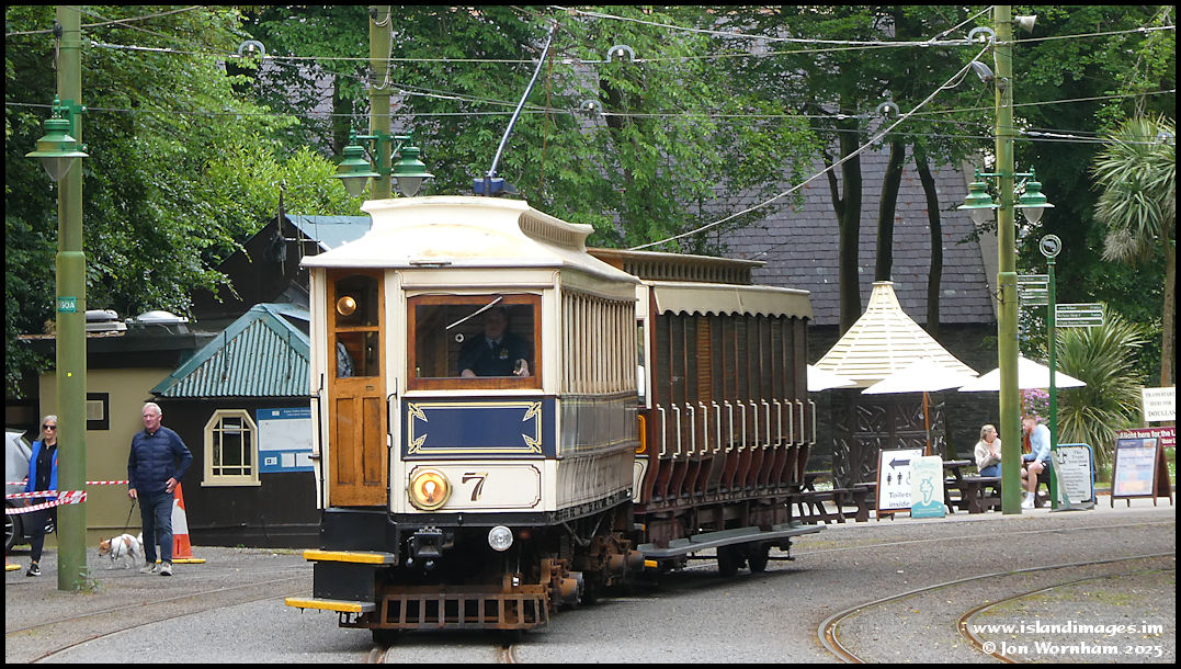 Car No 7 heads out of Laxey Station, desination Ramsey. No 7 was part of a batch of six new cars and six trailers delivered to the line in 1894 for the extension of the original line from Groudlle to Laxey.