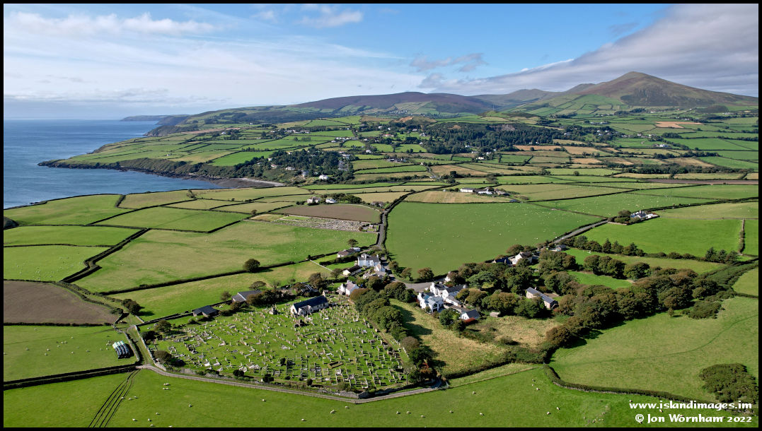 Looking to the south across Maughold village and the church site in 2022.