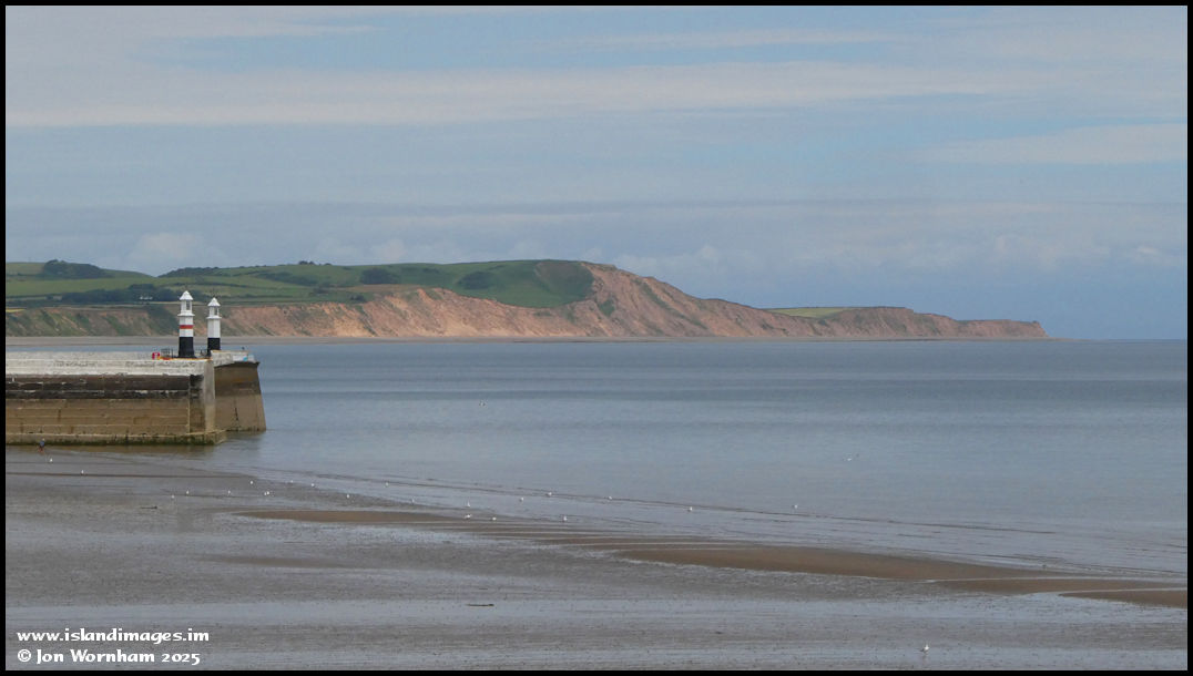 The view from the pier past the harbour breakwaters and to the Bride Cliffs. The lovely beach in the foreground was where a developer wanted to 'reclaim' it to build houses and a marina!