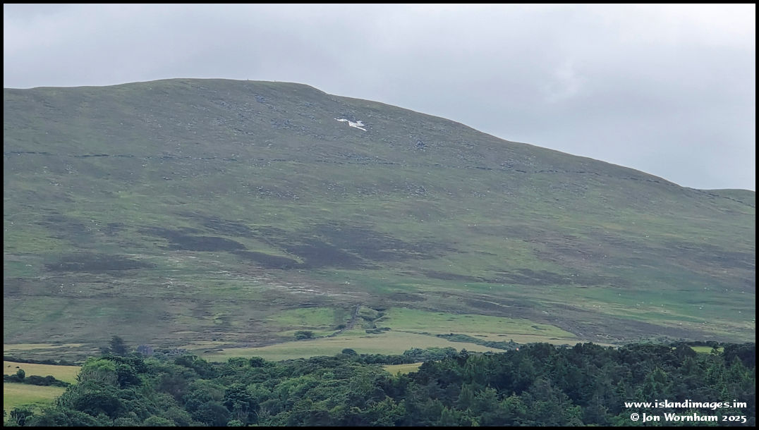 We had a great lunch at the Ramsey Swimming Pool cafe (super food!) and I took this picture of the triskelion on North Barrule with my phone from the doorway there.