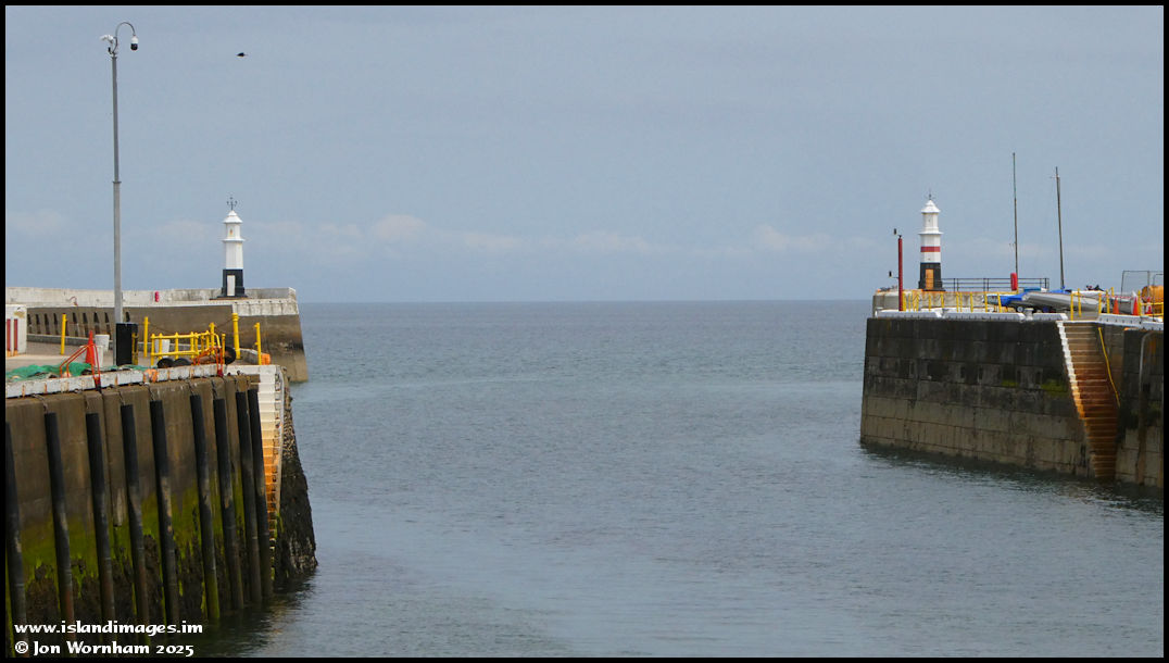 View from the swing bridge approach road, looking out to sea between the harbour breakwaters.