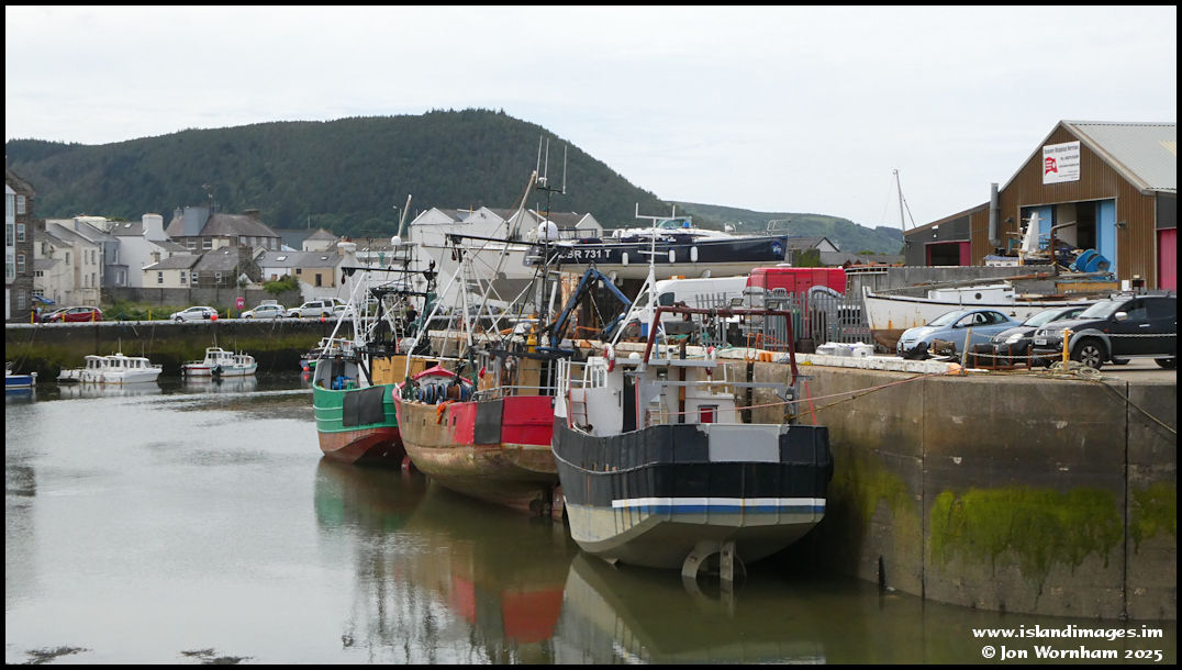 Fishing boats undergoing work at the Ramsey Shipyard, with Sky Hill rising behind.