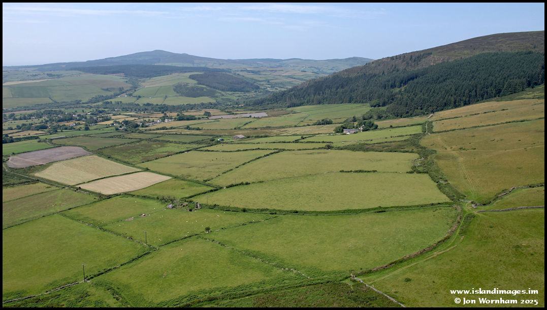 Looking back to the central valley here with Greeba rising to the right and South Barrule in the distance. The litlle ruin towards the centre of the picture is the tholtan of Ballaharry.