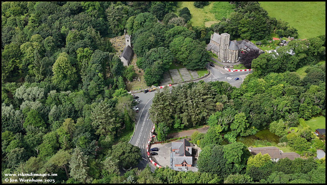 A closer look at the two churches and the Braddan Bridge area. Highly popular open air church services used to be held here and special trains would operate from Douglas to a halt located lower centre of picture.