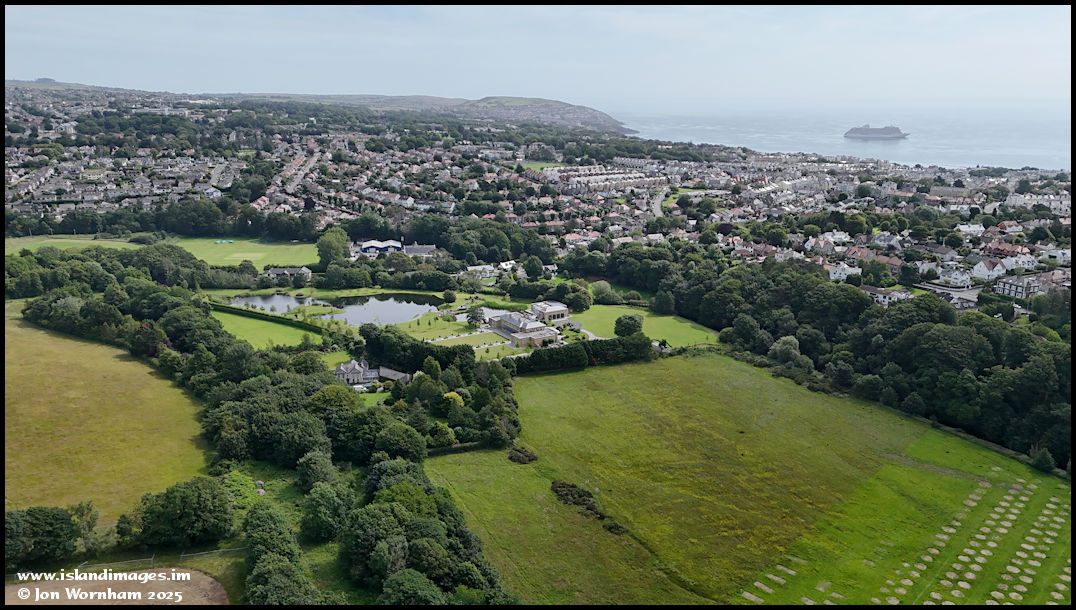 This view is to the Port-E-Chee and Bray Hill area of Douglas, with a visiting cruise ship anchored in the bay. The circles bottom right are where a tented village was constructed during the TT races.