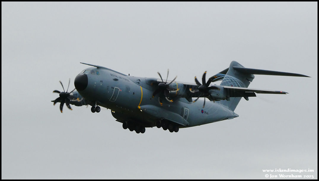Airbus Atlas ZM416 on the 'go-around' after a training approach at Ronaldsway. I do like the vortices generated by the propeller tips in moist air.