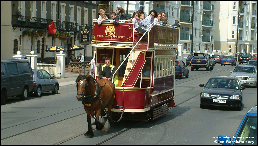 Dougla deck horse tram No 18 takes a trip along the promenade on the 17th July 2004, pictured passing the Queen's Hotel with 'Donald' in charge.