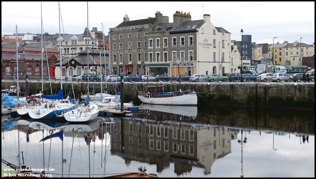 Reflections on a calm inner harbour at Douglas on the 4th of July 2012. The Douglas and Clarendon Hotels have since been demolished and replaced by newer buildings in a similar style.