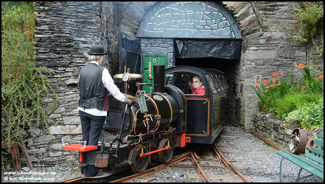 A train on the Great Laxey Mine Railway has just departed from the teminus and is about to enter the tunnel on the 4th July 2020. The driver has to sit down before they enter the tunnel!