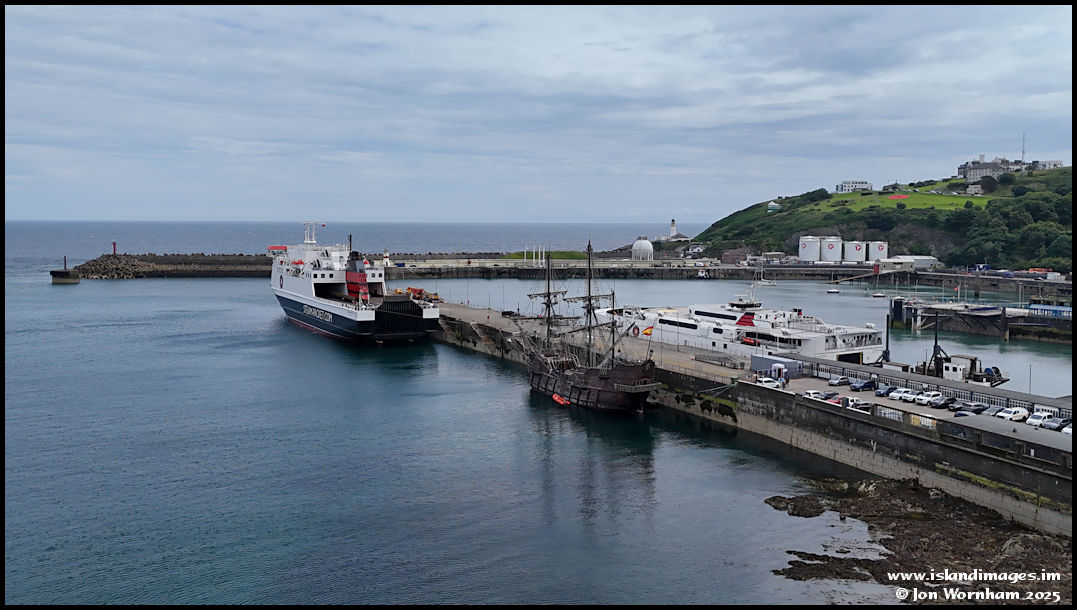 Three very different ships moored at the Victoria Pier.  The Ro-Ro ferry 'Ben my Chree', 'Galleon Andalucia' and fastcraft 'Manannan.  The orange RIB on the galleon was a distraction and removed from subsequent pictures!