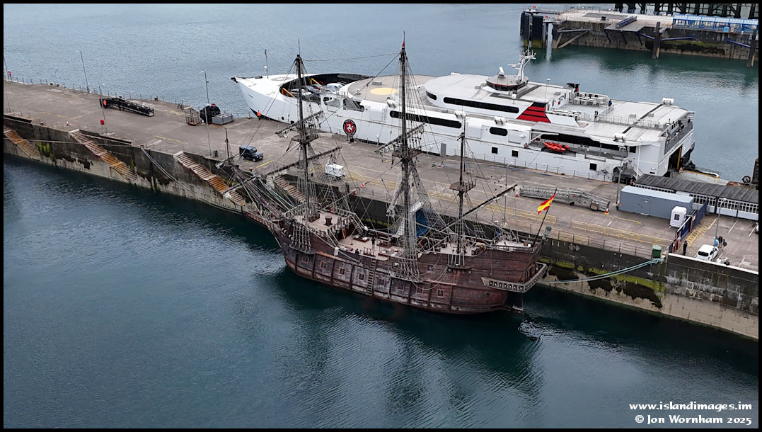 Flying round towards the stern to show the large accomodation area above the main deck.